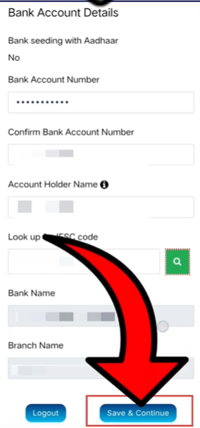 - अब अपना घर का पता, शैक्षणिक योग्यता, बैंक की जानकारी सब सही से भरकर Save And Continue पर क्लिक करे।