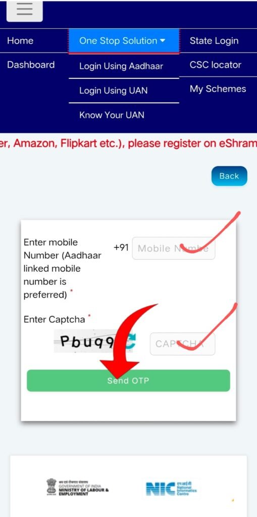 - अब अपना आधार कार्ड से लिंक मोबाइल नंबर डालकर कैप्चा को भरें और Send Otp पर क्लिक करें।