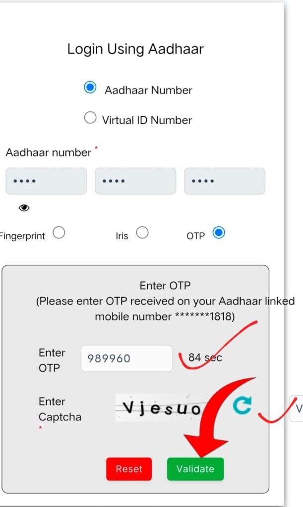 - OTP डाले , कैप्चा भरें, Validate OTP पर क्लिक करें।