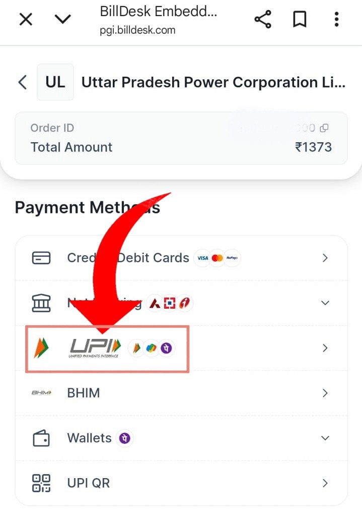 - अपनी सुबिधा अनुसार किसी भी एक पेमेंट मोड को चुने। उदाहरण के लिए हमने UPI के ऑप्शन को चुना है।