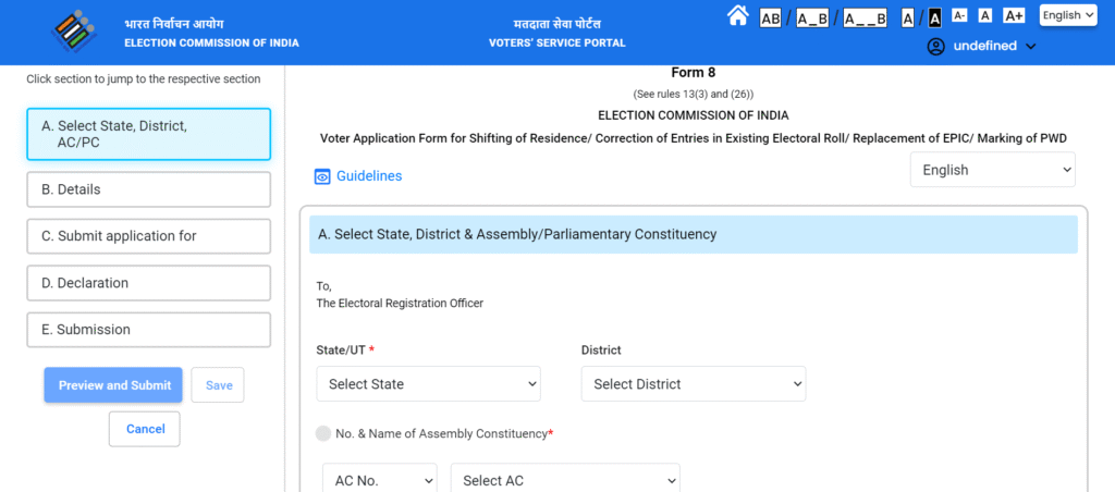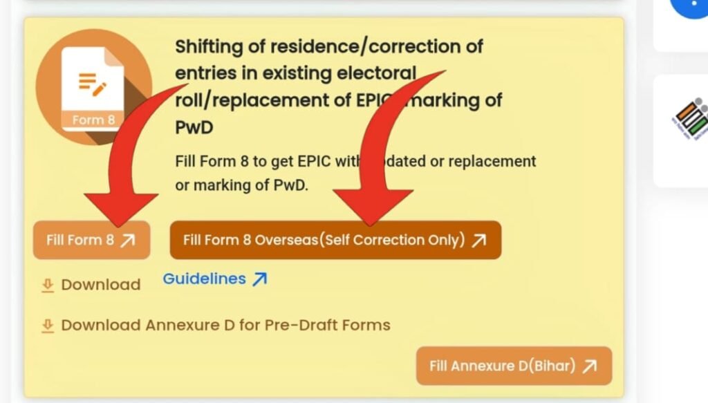 - Voter ID Correction Online 2025 के लिए Login के बाद पेज को नीचे की तरफ स्क्रॉल करके Form 8 का ऑप्शन चुने।