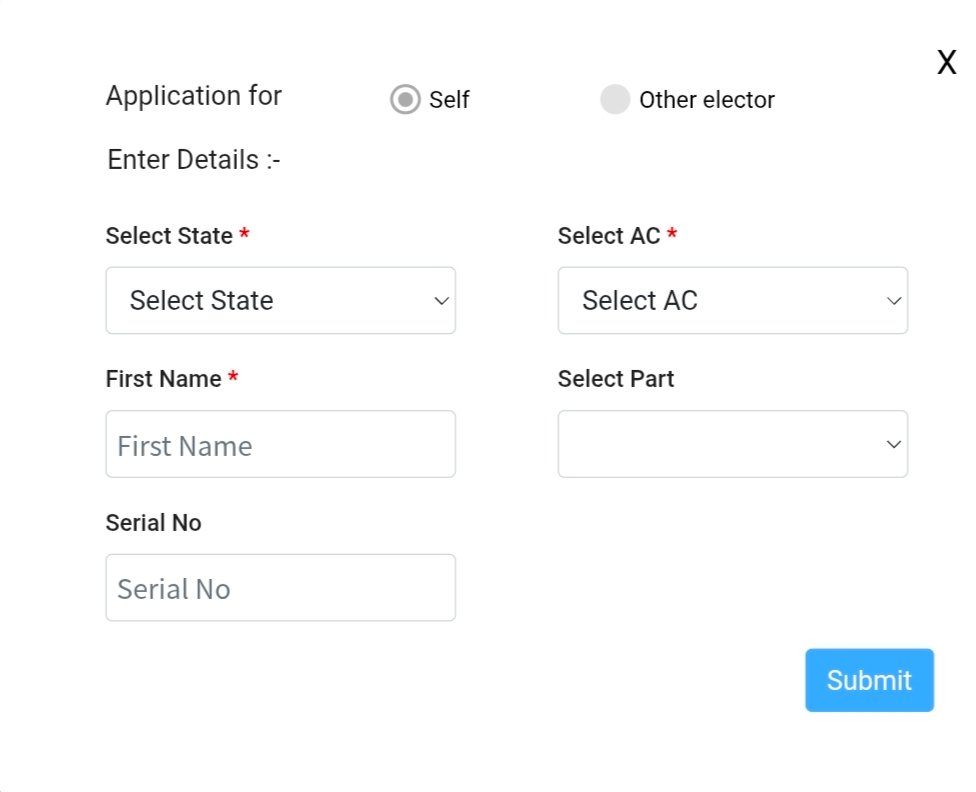 - अगर आप केवल खुद की वोटर आईडी ठीक करना चाहते हैं तो Fill Form 8 overseas(Self Correction Only ) का ऑप्शन चुनकर Self के ऑप्शन पर क्लिक करके अपना राज्य, बिधानसभा का नाम और अपना नाम डालकर Submit पर क्लिक करें ।