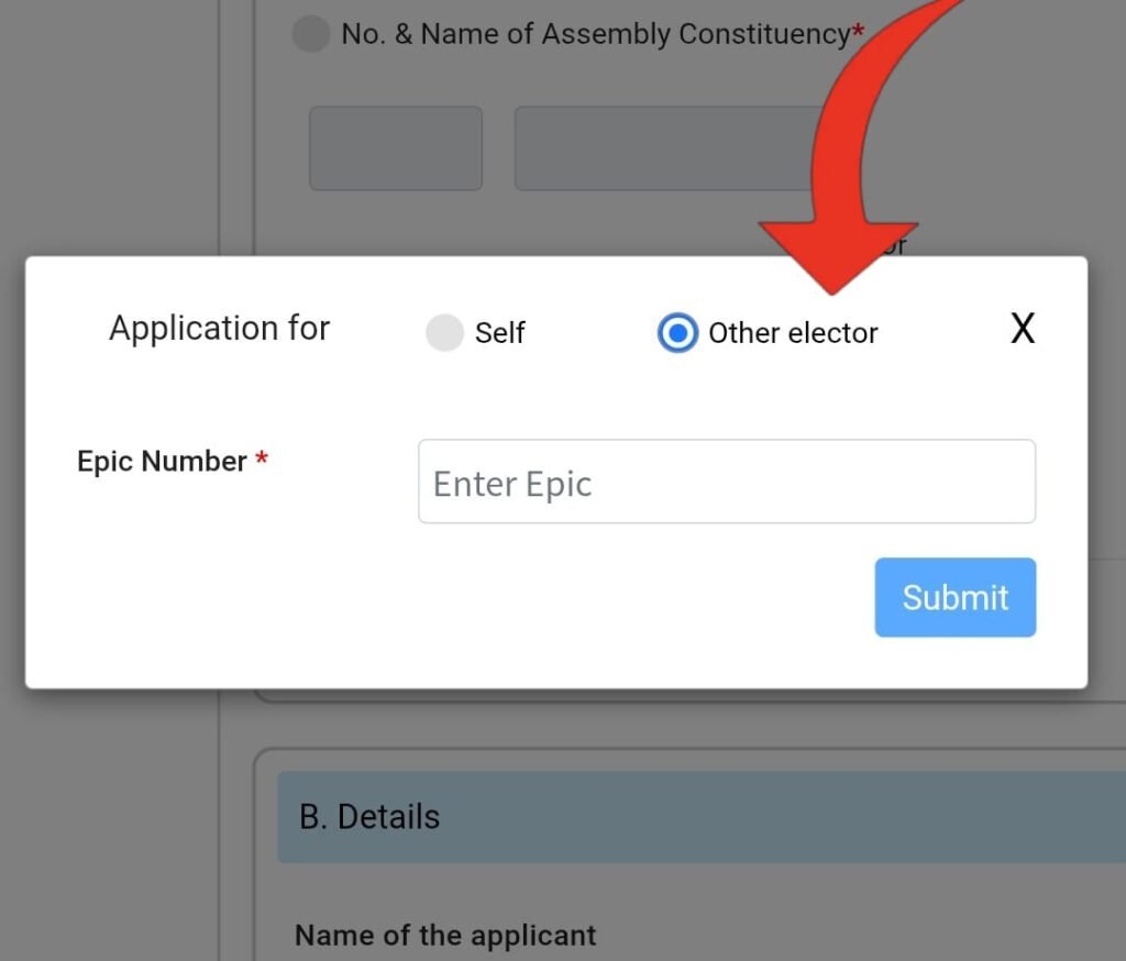- अगर आप किसी दूसरे की भी वोटर आईडी ठीक करना चाहते हैं तो Fill Form 8 का ऑप्शन चुने फिर other elector के ऑप्शन पर क्लिक करके EPIC नंबर डालकर Submit पर क्लिक करें ।